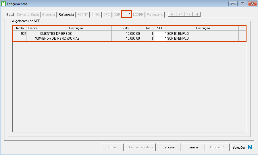 7. Acesse o menu Movimentos > Lançamentos e observe os dados incluídos na guia SCP.
