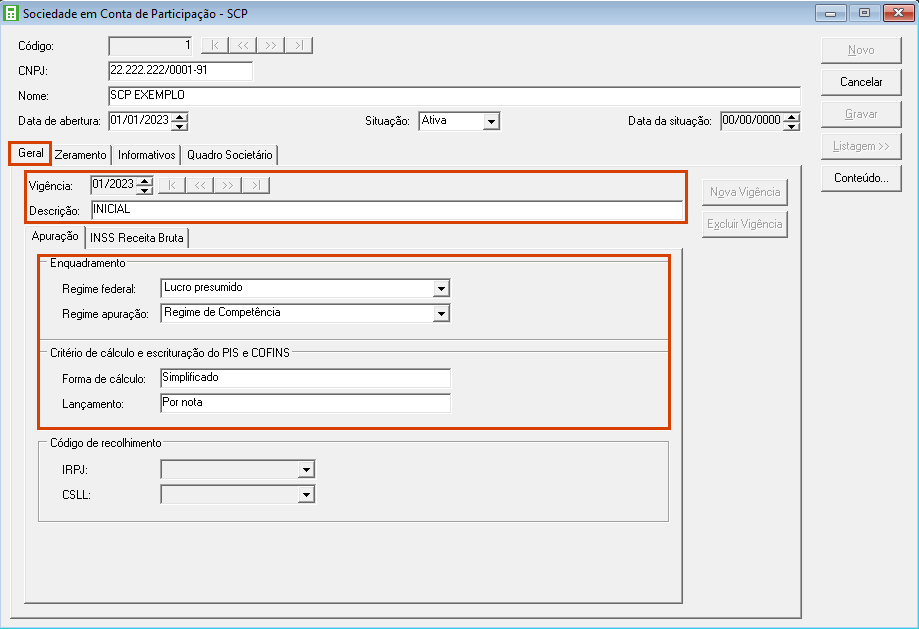 8. O quadro Código de recolhimento somente ficará habilitado quando no módulo Escrita Fiscal, os parâmetros da empresa estiverem informados os impostos IRPJ - SCP e CSLL - SCP;