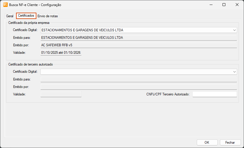 OBS: Somente estará disponível o certificado para seleção caso o mesmo já esteja instalado no computador que está sendo configurado o Busca NF-e.