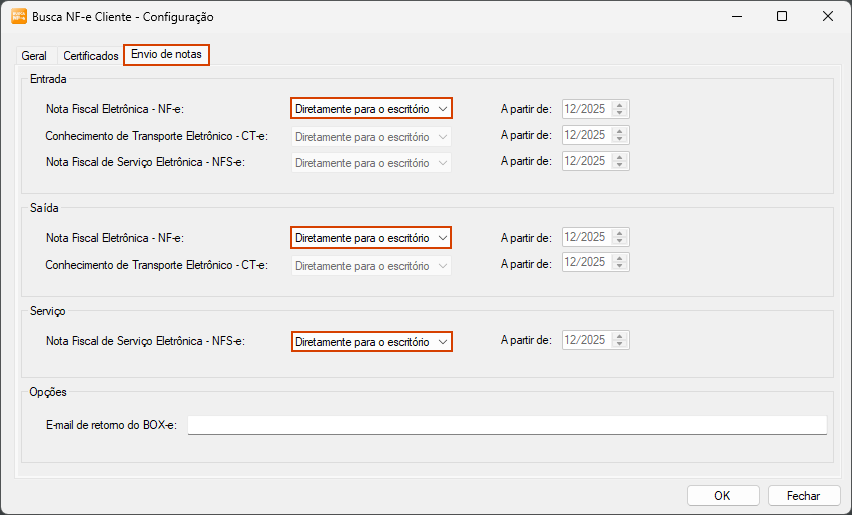 8. Na guia Envio de notas, quadros Entrada, Saída e/ou Serviços, selecione se o documento fiscal será enviado diretamente para o escritório ou para armazenamento no BOX-e;