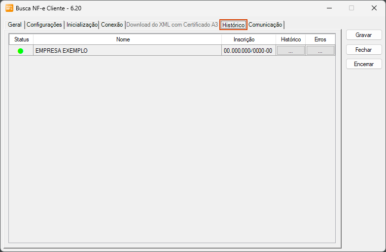 15. Na guia Histórico será demonstrado o Status de cada empresa configurada para importar/buscar os XML: