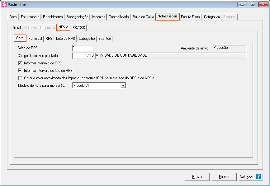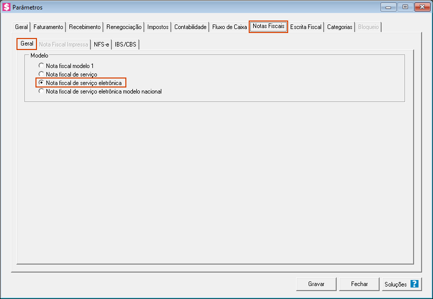 2. Na guia Notas Fiscais > Geral, selecione a opção '[x] Nota fiscal de serviço eletrônica';