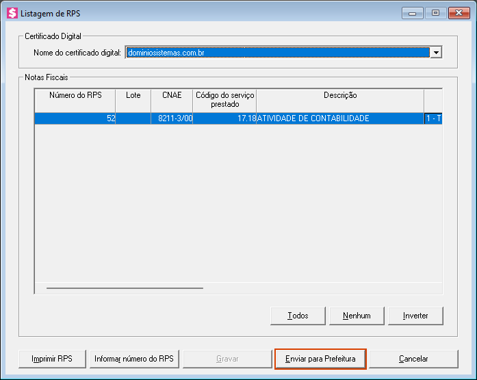 12. Clique no botão [Enviar para Prefeitura] para transmitir as informações do RPS;