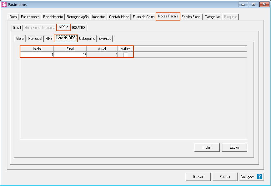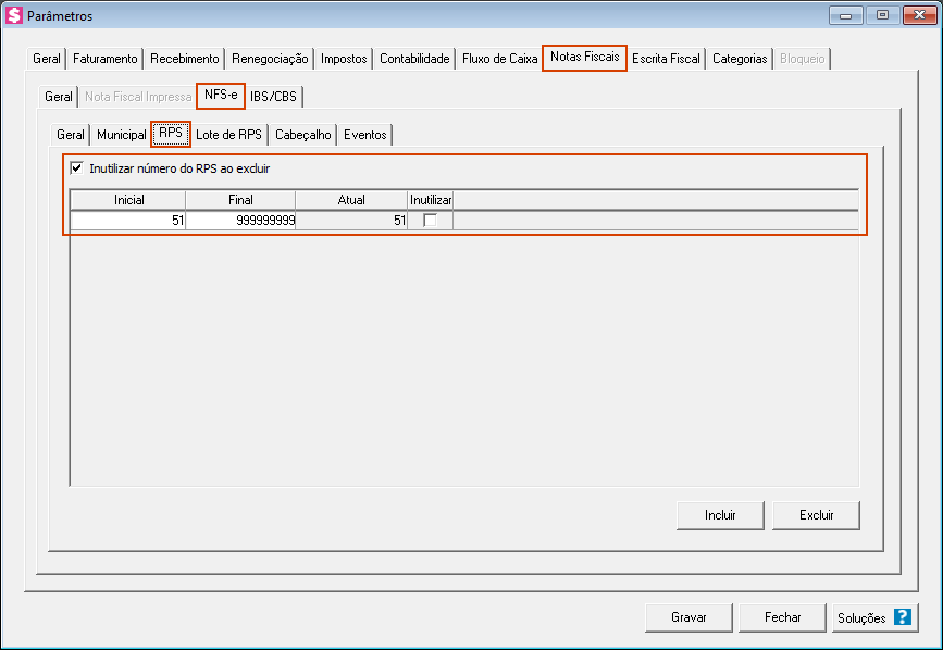 11. Clique em [Incluir], informe o número inicial do RPS na coluna 'Inicial' e digite '999999' na coluna 'Final'
