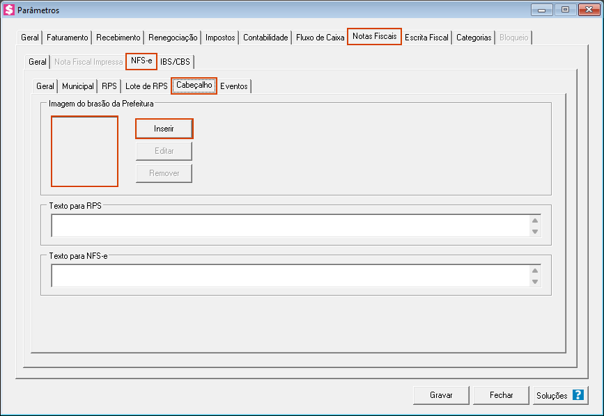 13. Na guia Cabeçalho, configure o brasão da prefeitura e o texto que será exibido no RPS e NFS-e.