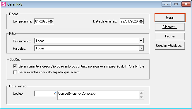 3. No quadro Filtro, informe o tipo de faturamento e as parcelas que devem gerar RPS;