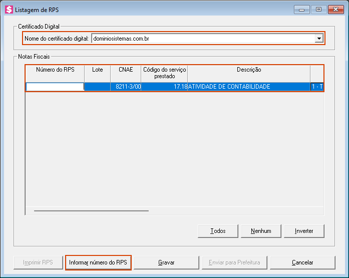 9. Clique no botão [Informar número do RPS] para gerar o Número da RPS;