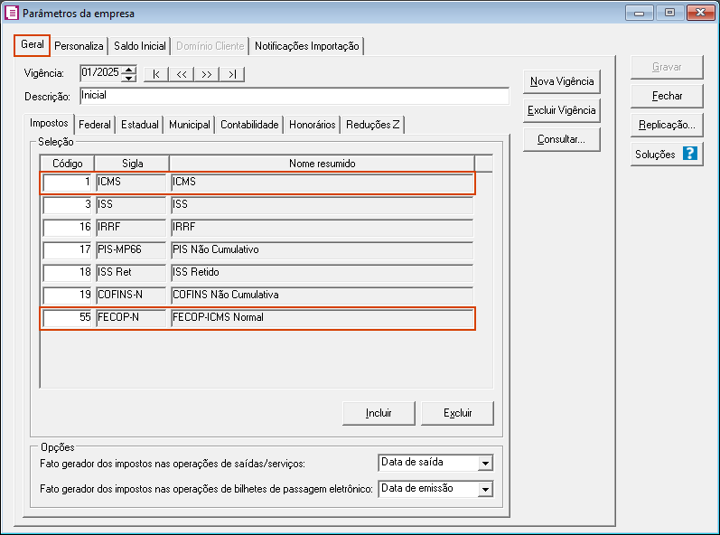 2. Na guia Geral, subguia Impostos, inclua os impostos ‘1-ICMS’ e ‘55-FECOP-N’;