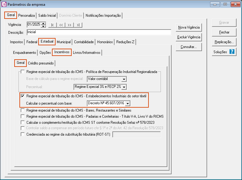 3. Na guia Geral, subguia Estadual, subguia Incentivos, selecione a opção ‘[x] Regime especial de tributação do ICMS – Estabelecimentos Industriais do setor têxtil’ e escolha: