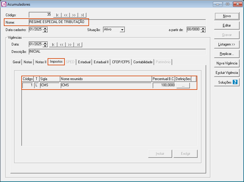 1. Acesse o menu Arquivos > Acumuladores e localize ou crie um acumulador para operação com regime especial de tributação;
