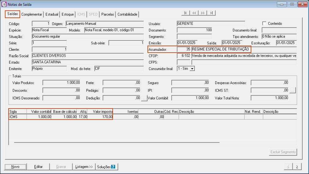 1. No menu Movimentos > Saídas, faça um lançamento com o acumulador com regime especial de tributação;