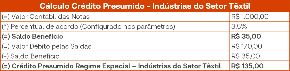 O campo ‘Regime Especial - Indústrias do Setor Têxtil’ refere-se ao valor das notas fiscais estaduais lançadas com o regime especial de tributação. O cálculo é feito multiplicando o valor contábil das notas pelo percentual de acordo definido.