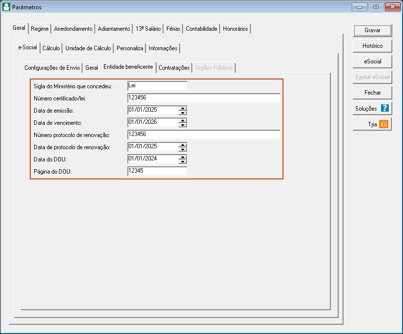1. Acesse o menu Controle > Parâmetros, na guia Geral > eSocial > Entidade Beneficente;