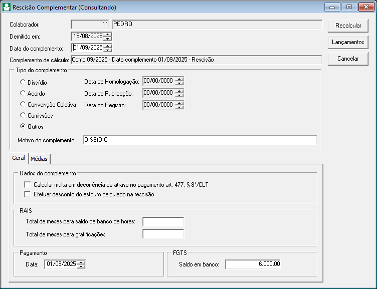 Em rescisões complementares, se o motivo está definido como Dissídio ou Convenção, ajuste para outro tipo de complemento, dessa forma: