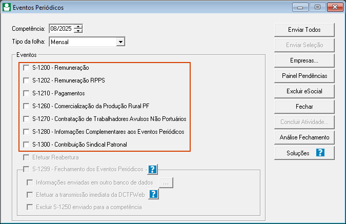 5. Após validados, retorne à janela de Eventos Periódicos, selecione o evento '[x] S - 1299 - Fechamento dos Eventos Periódicos' e clique no botão [Enviar].