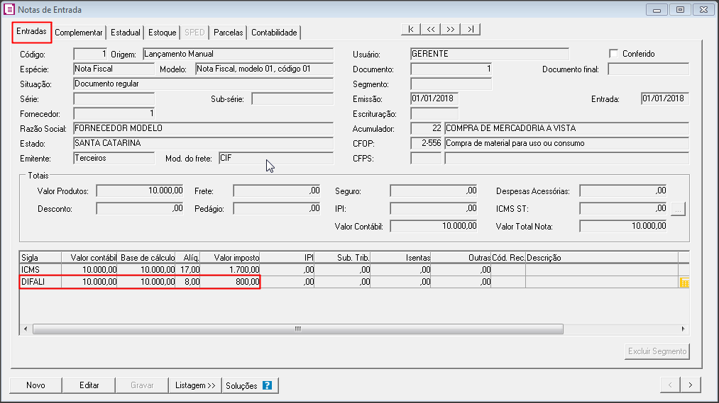 OBS: Para este exemplo utilizamos o imposto DIFAL, e preenchemos o valor de base de cálculo, alíquota e valor do imposto.