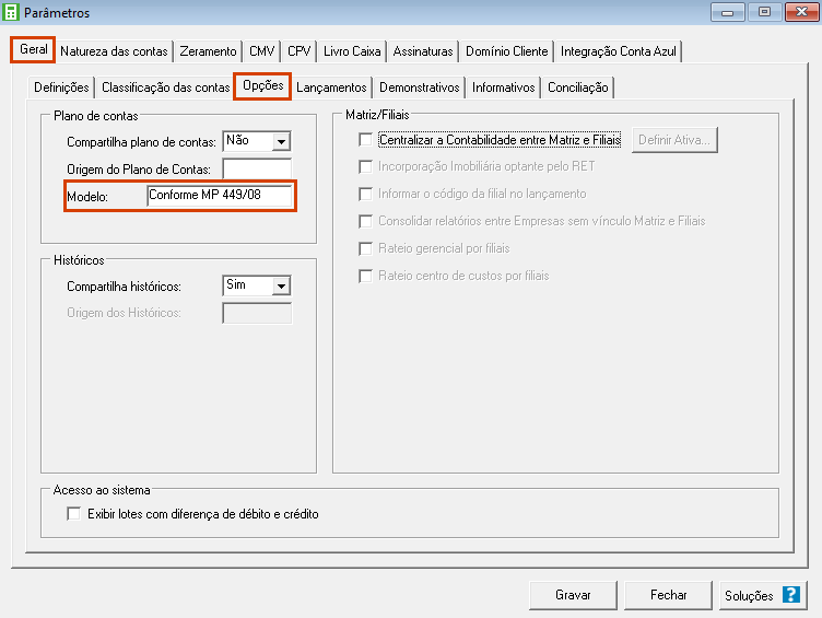 2. No quadro Plano de contas, campo Modelo, selecione a opção ‘Conforme MP 449/08’ e clique no botão [Gravar].