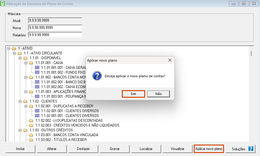 5. O sistema perguntará se deseja aplicar o novo plano de contas, clique no botão [Sim] para finalizar.