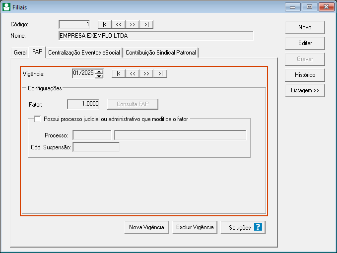 3. No quadro Configurações, no campo Fator, informe o valor do FAP da empresa;