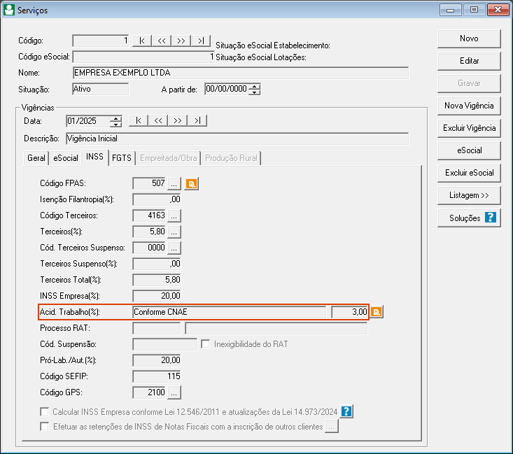 Para essa situação, basta criar uma vigência do FAP no cadastro de filiais e informar o RAT nos serviços, dessa forma: