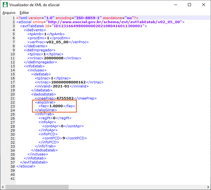 2. Abaixo da Tag <cnaePrep> informe as tags abaixo, onde no lugar do X informe o percentual do FAP: