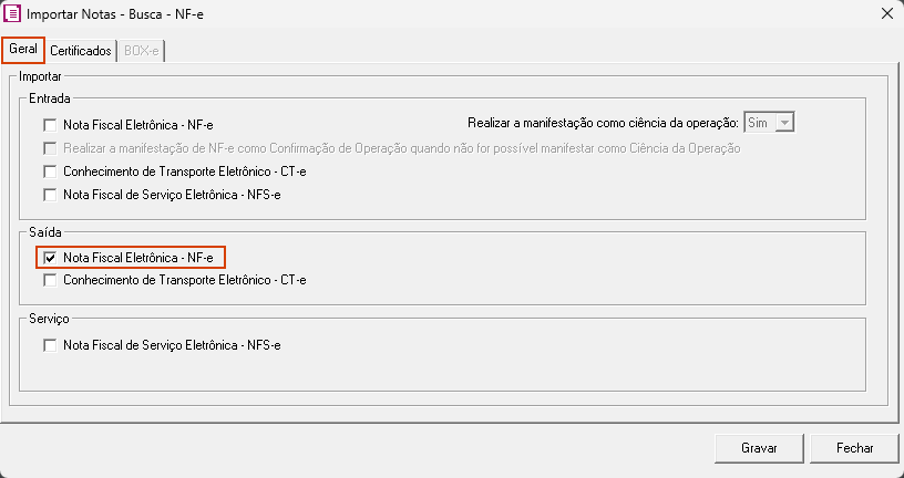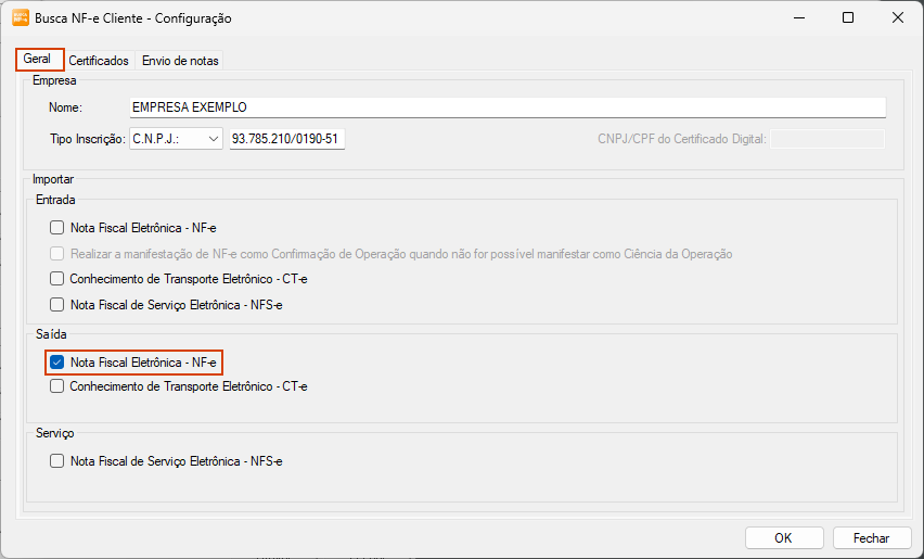 3. Na guia Geral, defina quais modelos de nota de saída a contabilidade irá baixar (NF-e ou CT-e, ou ambas) e marque as opções correspondentes;