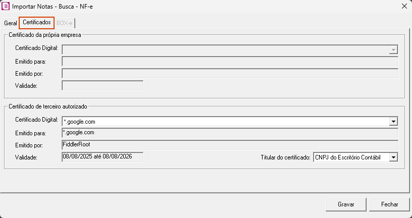4. Na guia Certificado Digital, na opção Certificado de Terceiro Autorizado, selecione o certificado conforme represente autorizado no emissor das notas;