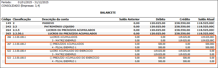 Antes de realizar o lançamento entre as empresas é necessário que seja avaliado por meio do Balancete os valores apurados de Lucro/Prejuízo para cada delas: