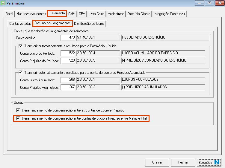 2. No quadro Opção, selecione '[x] Gerar lançamento de compensação entre contas de Lucro e Prejuízo entre Matriz e Filial;