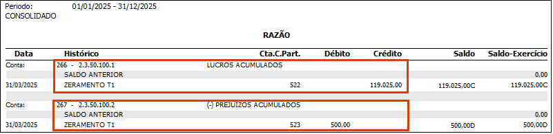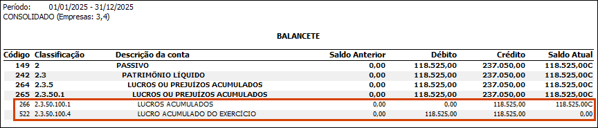 Ao emitir o balancete do período de 01/01/2025 a 31/03/2025, com a opção '[ ] Não confrontar o saldo das contas de Lucro e Prejuízo' desmarcada, o sistema demonstra o saldo das contas de Lucro e Prejuízos Acumulados de forma consolidada.