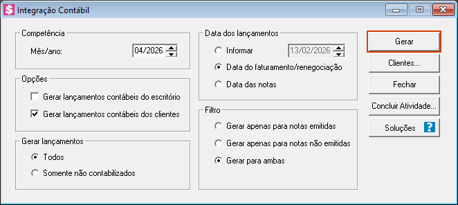 5. Marque se deseja gerar os lançamentos do '[x] Escritório', dos '[x] Clientes' ou ambos;