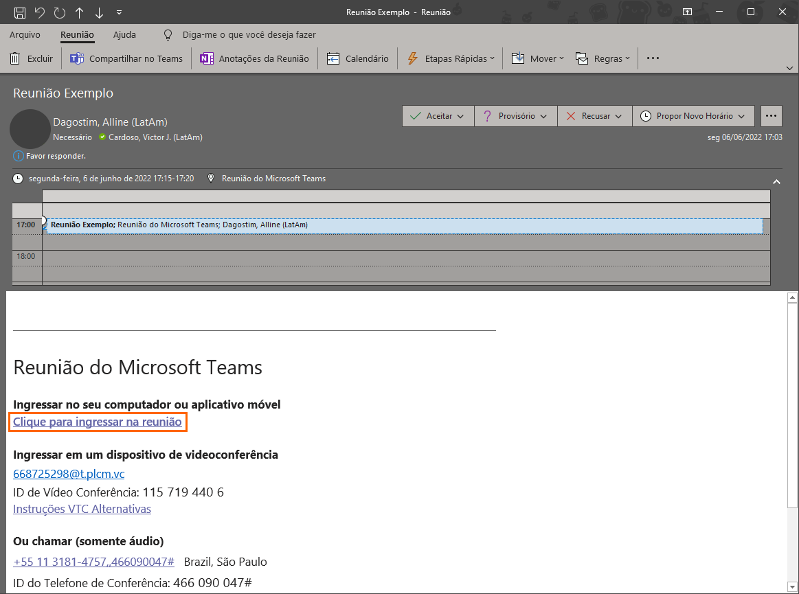 2 - No dia do treinamento, você receberá um e-mail do técnico com o link para acesso à reunião conforme imagem abaixo: