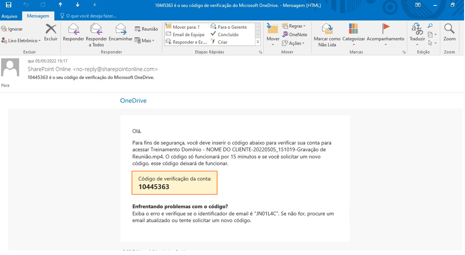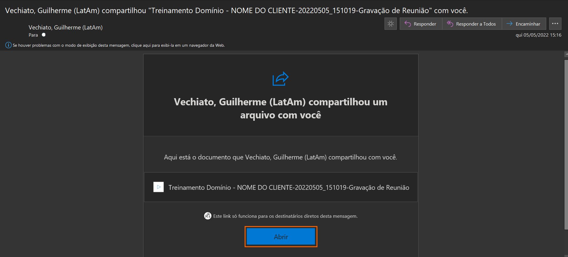 5 - Após o treinamento, o técnico irá enviar a gravação por e-mail, conforme exemplo abaixo:
