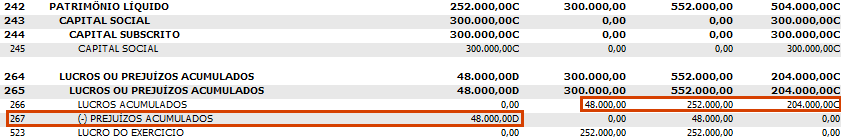• Dessa forma, a empresa possui um lucro de R$ 252.000,00 no período de 2025, que diminuído do saldo de prejuízo acumulado do período anterior, gera um saldo credor na conta de Lucros acumulados de R$ 204.000,00;