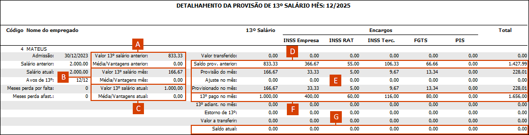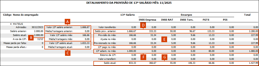 D Saldo prov. anterior: É o valor total (13° + Médias/Vantagens) calculado nas competências anteriores, que serve como base de cálculo dos encargos;