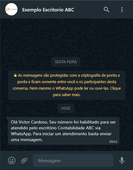 Para utilizá-lo é muito simples, quando o seu escritório lhe habilitar para utilizar o Domínio Messenger, você receberá uma mensagem de aviso, semelhante ao da imagem a seguir. Após, basta iniciar uma conversa ou fazer a solicitação, que o assistente virtual irá te responder.